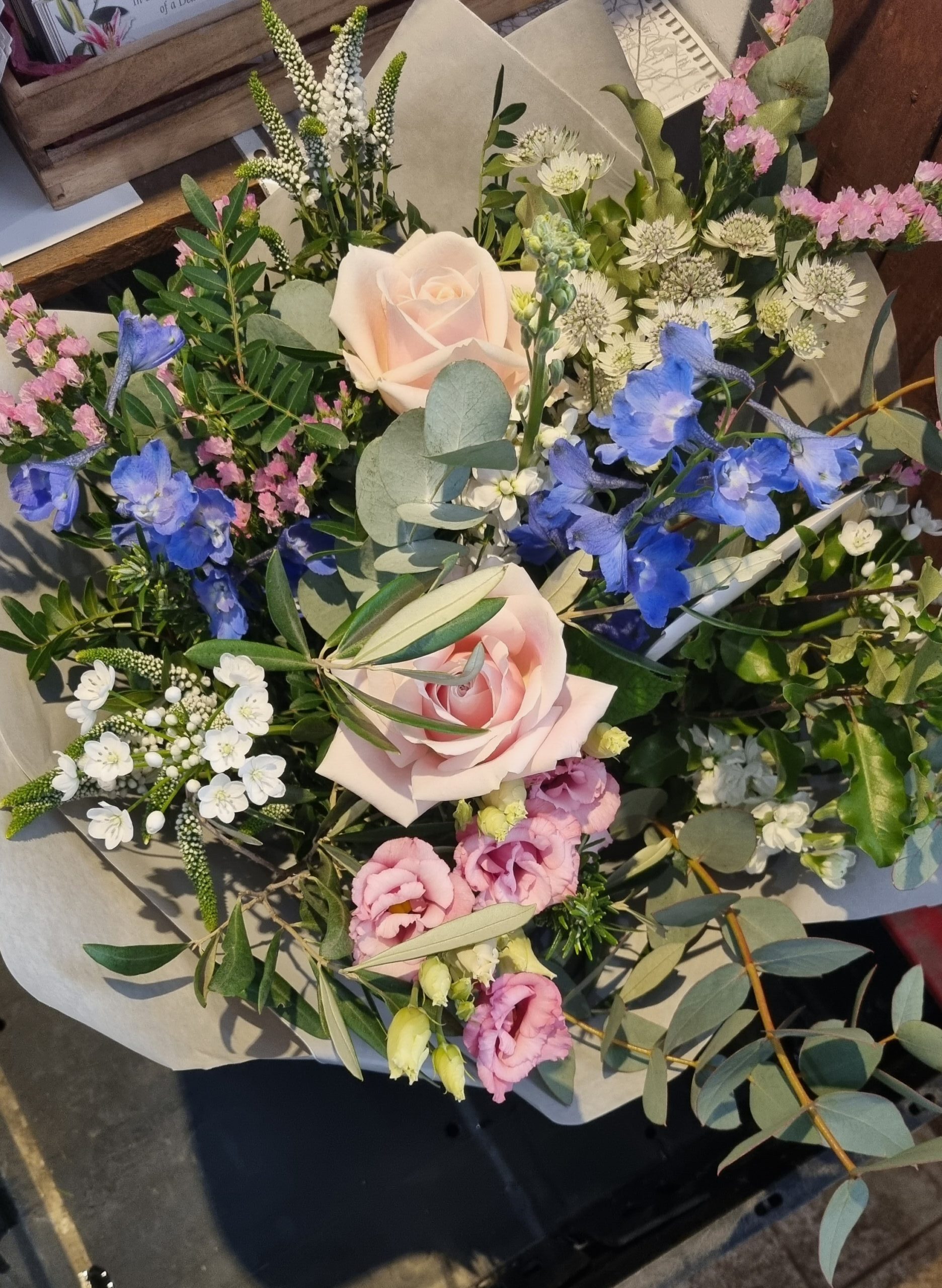 Soft pastel pinks with blues combining roses, delphinium and some seasonal stems such as ranunculus and astrantia.